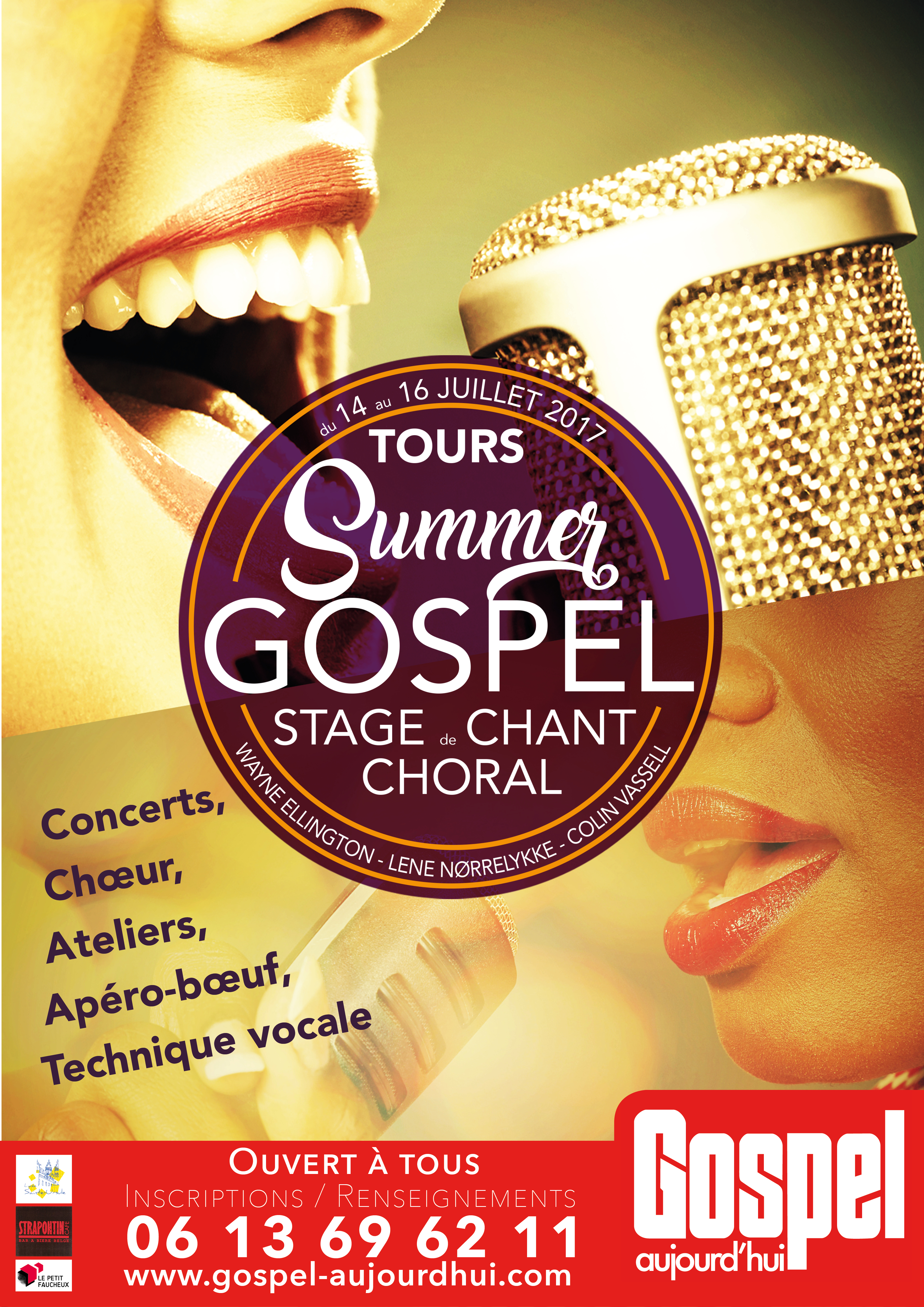 A vos agendas, le Summer Gospel aura lieu du 14 au 16 juillet 2017 sur Tours avec Wayne Ellington, Lene Noerrelykke, Colin Vassell. Stage, concerts, apéro-boeuf gospel sont au programme, on vous attend !! STAGE COMPLET !!! BILLETTERIE DES CONCERTS DU 15 ET 16/07 EN VENTE UNIQUEMENT EN LIGNE DES MAINTENANT sur https://gospel-aujourdhui.festik.net/